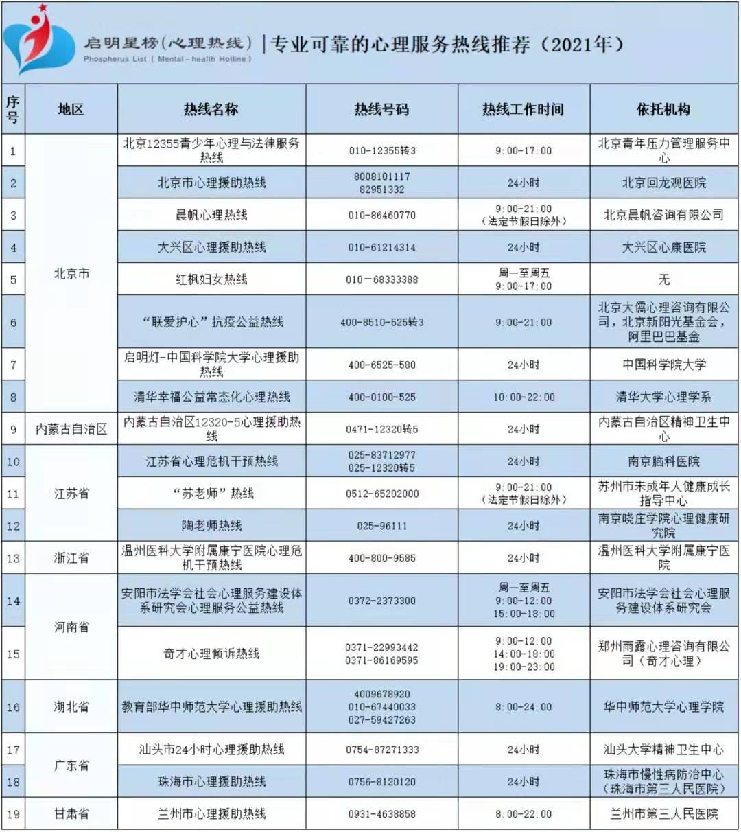2021年中國(guó)心理學(xué)會(huì)臨床心理注冊(cè)系統(tǒng)開(kāi)展“中國(guó)心理熱線服務(wù)調(diào)查項(xiàng)目”評(píng)選出19條專(zhuān)業(yè)可靠的心理服務(wù)熱線(奇才心理熱線再次上榜),榜單上的熱線電話專(zhuān)業(yè)可信,有需要大家都可以撥打。