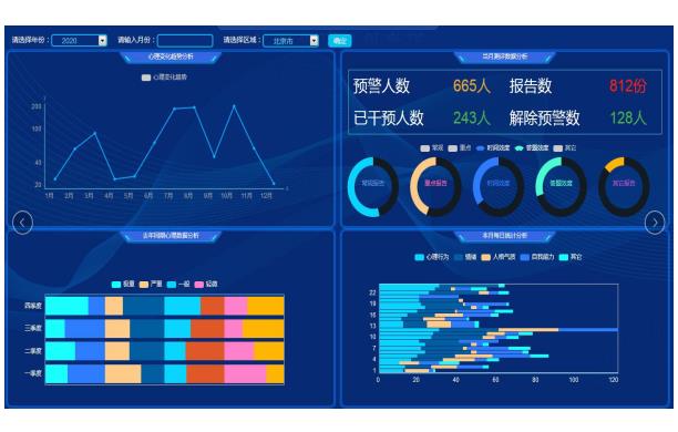 3、數(shù)據(jù)中心:展示用戶的心情數(shù)據(jù)、登錄數(shù)據(jù)、性別統(tǒng)計、年齡統(tǒng)計等數(shù)據(jù),為用戶單位提供可視化的信息數(shù)據(jù)管理模塊,圖標(biāo)模式的展現(xiàn)方式提升心理健康中心的科技感與信息化效果。