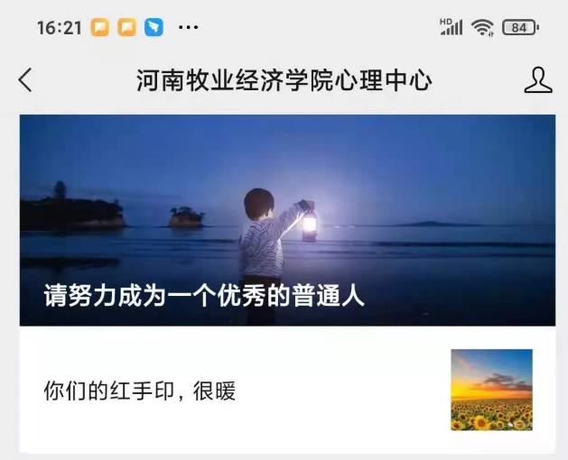 河南牧業(yè)經(jīng)濟(jì)學(xué)院心理中心微信公眾平臺,定期更新心理健康科普文章,讓您輕松獲取與生活、學(xué)習(xí)密切相關(guān)的心理學(xué)知識及心理健康調(diào)節(jié)方法。
